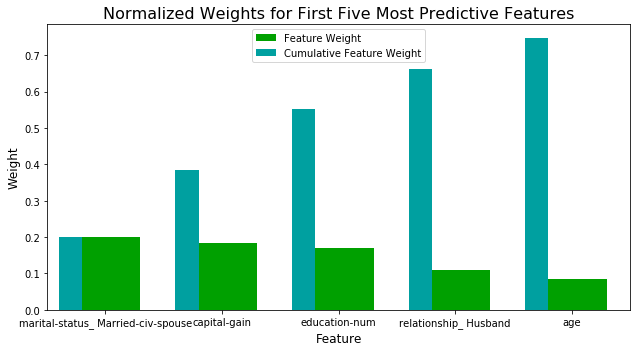 Observe the visualization created above which displays the five most relevant features for predicting if an individual makes at most or above $50,000.